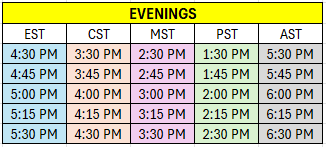 Afternoons (BLUE): Monday, Tuesday, Wednesday, Friday